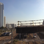 11月20日に確認したところ、建設中の鹿島田跨線歩道橋が京急ストア側から新川崎駅方面にまた少しスライドした。今回は、足場のある位置までではなく途中までの移動となっているため、橋が浮いている状態になっている。